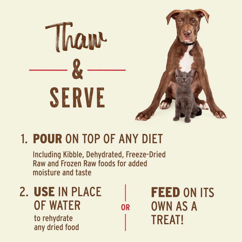 Once thawed, feeding amounts will be based on your pet’s size and hydration needs — there is no such thing as too much hydration and you can’t over-do it! As with any new product you are introducing into your pet’s diet, start slowly with 1 oz per meal per 20 lbs of weight and work your way up to an amount that works for you and your pet.