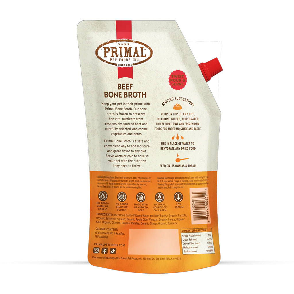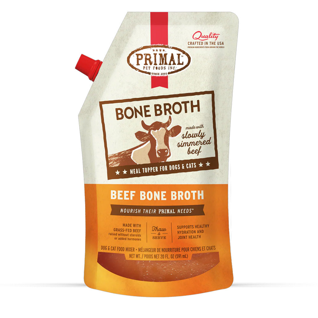 Bone Broth is a wholesome addition to any feeding regimen. When served on its own, added to commercial pet food, or along with any complete, balanced Primal Formula, Bone Broth adds necessary moisture and beneficial nutrients into your pet’s diet. With key benefits including digestion and liver support, hydration and moisture, joint health, and more, supplementing with Bone Broth is an easy way to keep your pet hydrated and healthy. Primal Bone Broth is appropriate for dogs and cats at all stages of life.