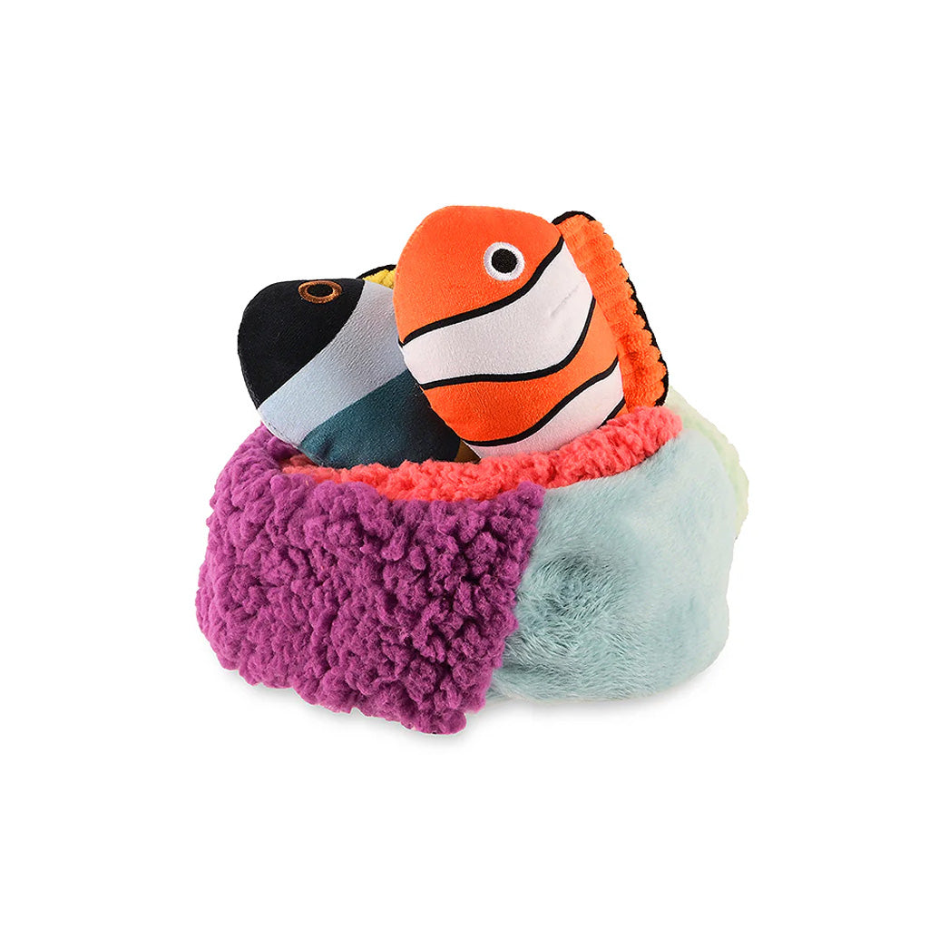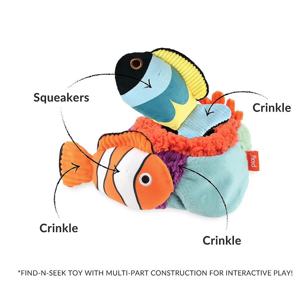 • Includes one crinkly coral reef and two detachable squeaky fish toys