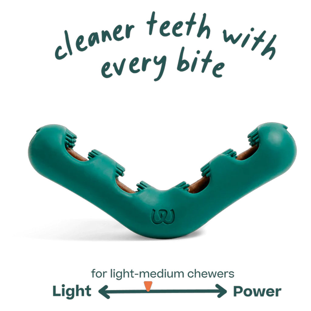 The v-shaped design of the Bite n’ Brush lets dogs brush their own teeth with special bristles sized just right to scrub plaque and tartar from all sides of the teeth and mouth. Add in a refill—packed with ingredients that support oral health like peppermint, parsley, and kelp—and let your dog chew away for 5-10 minutes. Make sure to monitor your dog while they brush their teeth! The Bite n’ Brush is designed to extend the time it takes to chew a dental treat, so you can get some peace and quiet and the active ingredients can get to work.