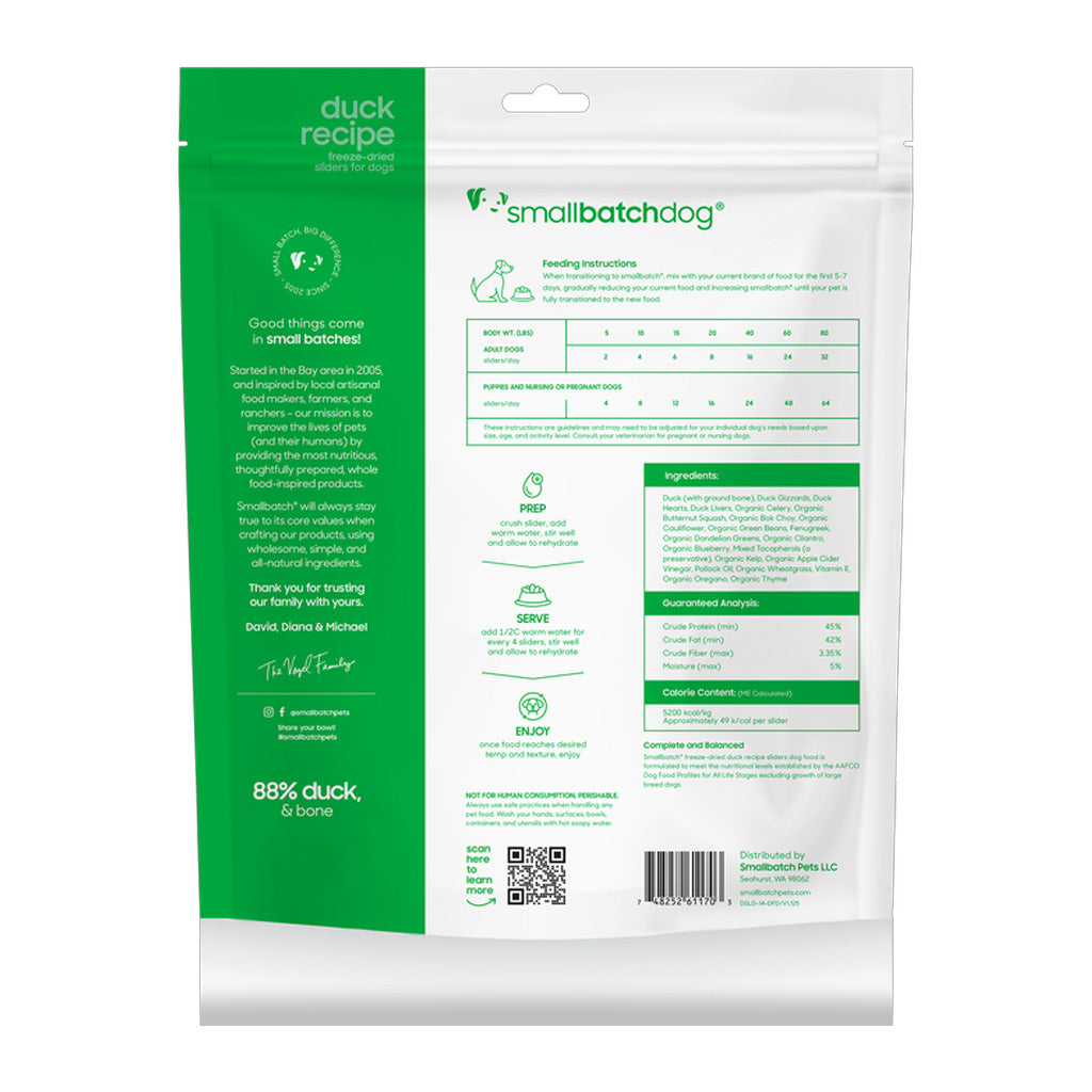Smallbatch Duck Sliders provide dogs with wholesome, raw food. This recipe is made with 88% meat (including muscle meat, organs and bone), 10% produce and 2% supplements. The meat is free-range, pasture raised and always free of hormones and antibiotics. Smallbatch only uses 100% certified Organic fruits and vegetables and the supplements are always pure, organic, and unrefined. The ingredients are gently freeze-dried to ensure the nutrients are protected. No HPP (high pressure pasteurization), only freeze-dried raw ingredients. This recipe is proudly made in California.