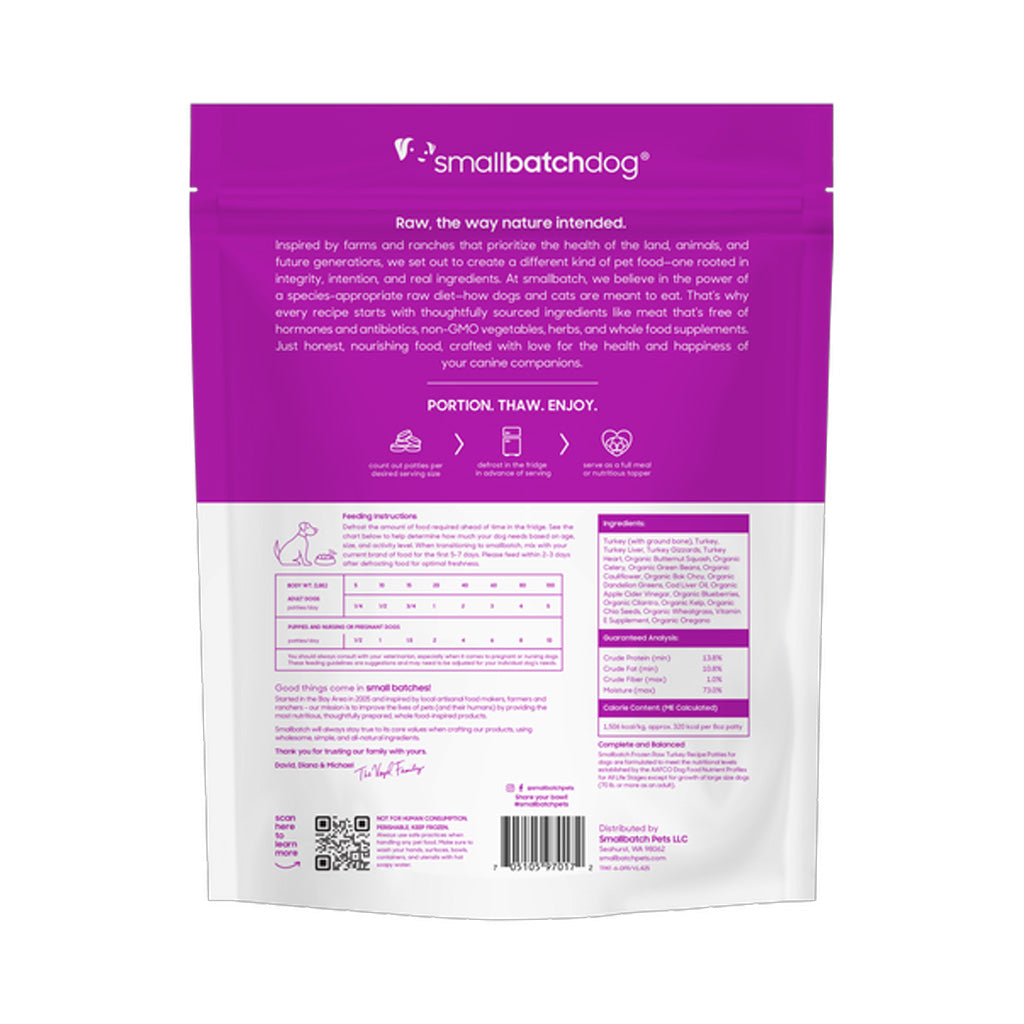 Ingredients: Turkey, turkey necks, turkey backs, turkey livers, turkey hearts, turkey gizzards, organic squash, organic celery, organic cauliflower, organic green beans, salmon oil, organic bok choy, organic apple cider vinegar, organic kelp, organic dandelion, organic cilantro, organic bee pollen, organic wheat grass, organic bilberry, organic garlic, organic thyme, organic oregano.
